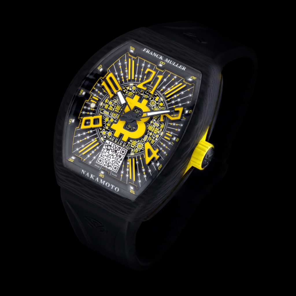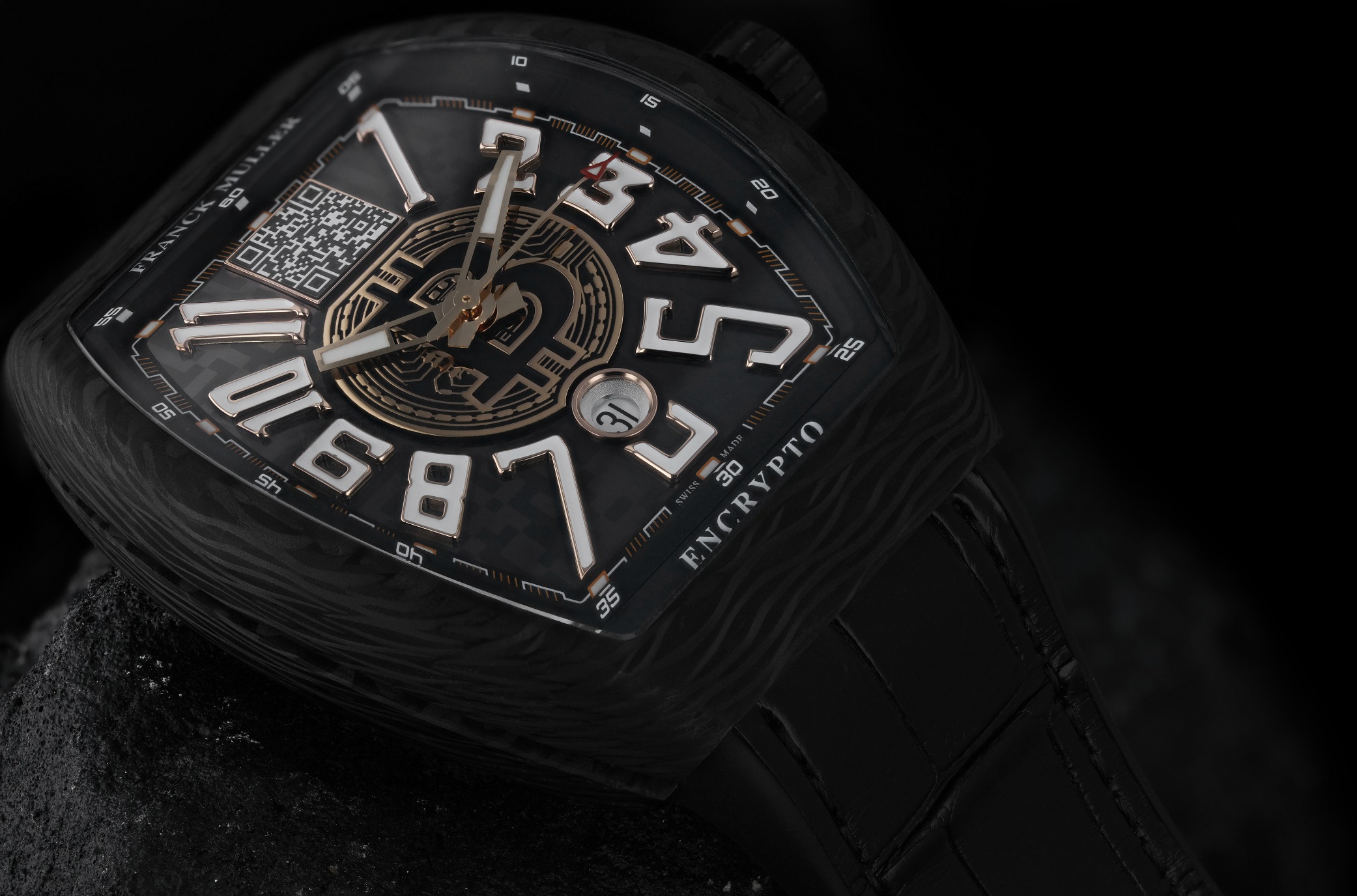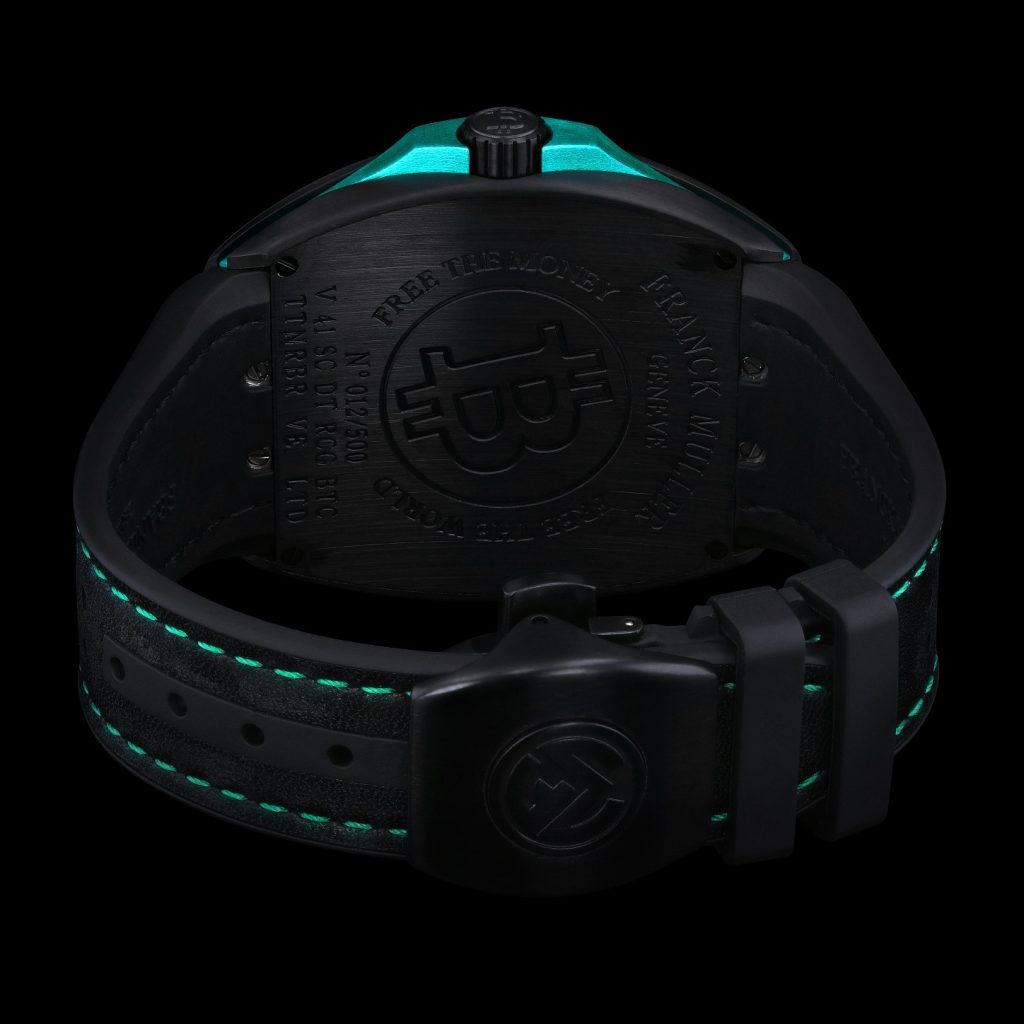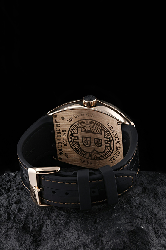 The High Roller black carbon fibre time piece is a stunning piece of watchmaking art, the case has gold infused within the carbon fibre, unique to Franck Mullers ultra-limited-edition pieces. A skeletonized dial gives way to the intricate inner workings.
