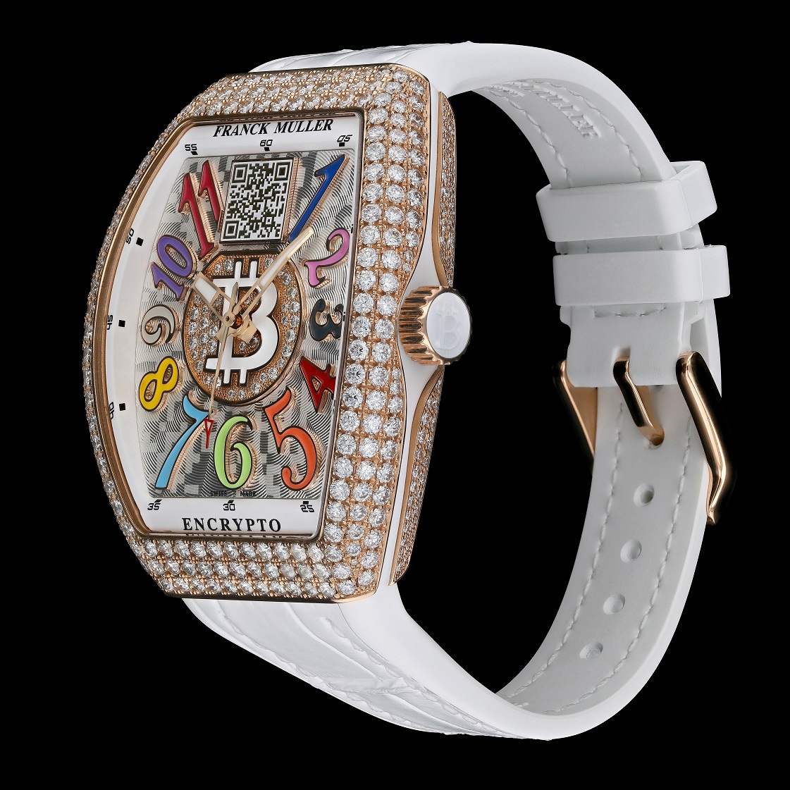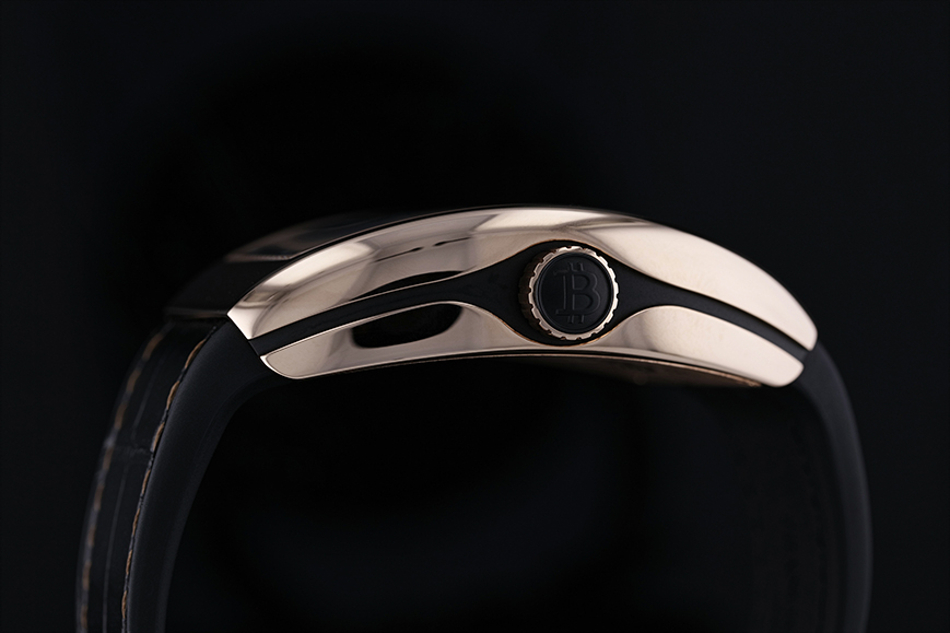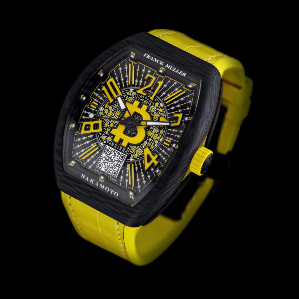 The High Roller black carbon fibre time piece is a stunning piece of watchmaking art, the case has gold infused within the carbon fibre, unique to Franck Mullers ultra-limited-edition pieces. A skeletonized dial gives way to the intricate inner workings.